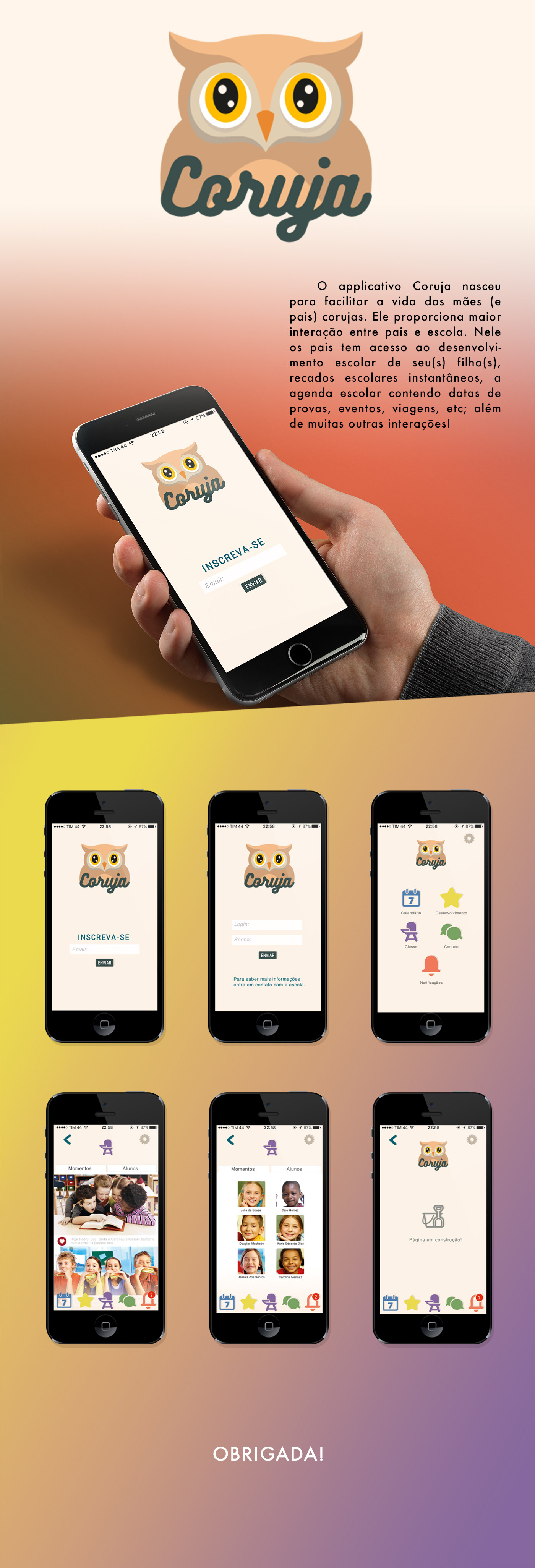 Coruja é um projeto de um aplicativo construído para as aulas de Ergodesign do curso de Design. Coruja é um app de comunicação pais-escola, desenvolvido para facilitar a interação entre professores/escola e os pais de crianças.